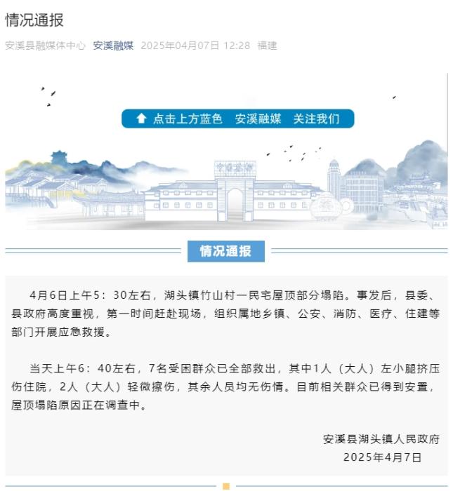中新网4月7日电 据“安溪融媒”微信公众号消息,福建省泉州市安溪县湖头镇人民政府发布情况通报称,4月6日上午5:30左右,湖头镇竹山村一民宅屋顶部分塌陷。事发后,县委、县政府高度重视,第一时间赶赴现场,组织属地乡镇、公安、消防、医疗、住建等部门开展应急救援。