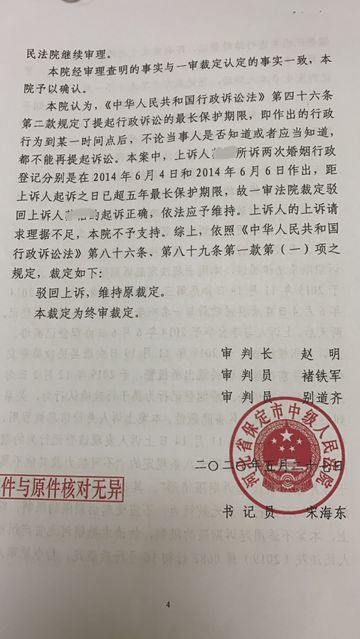 定州市人民法院的行政裁定,不予受理苏女士的起诉。 二审时,保定市中级人民法院依旧认为该诉讼已经超过5年起诉期限,维持原裁定。该裁定落款时间为2020年5月27日,盖有保定市中级人民法院公章。