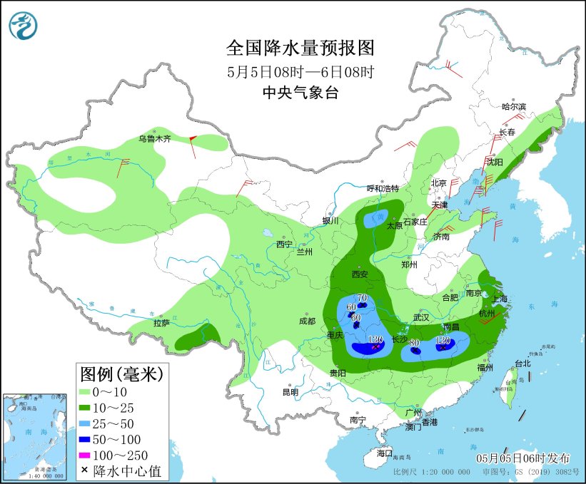 5月5日08时至6日08时,四川东部、重庆大部、湖北西南部、贵州东北部、湖南西北部和东部、江西中部、福建西北部以及陕西北部、山西西部等地部分地区有大到暴雨,其中,湖南西部、江西中部等地局地有大暴雨(100~120毫米)。内蒙古大部、吉林中西部、辽宁、天津、山东、河北东北部、浙江中东部等地部分地区有4~6级风,阵风7~8级。渤海、黄海中东部和东南部、东海北部海域将有7~8级、阵风9~10级的大风,渤海海峡、黄海北部海域将有7级、阵风8级的偏北风。