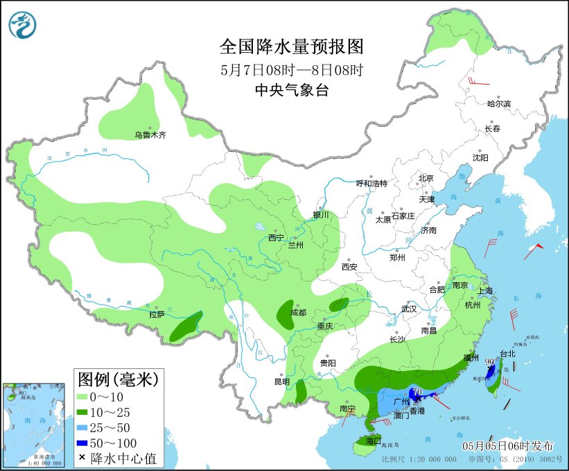 5月7日08时至8日08时,西藏东南部、福建东南部、四川盆地西南部、华南中东部、台湾岛等地部分地区有中到大雨,其中,广东南部沿海、台湾岛西北部等地局地有暴雨(50~90毫米)。内蒙古东北部、辽东半岛、浙江东部等地部分地区有4~5级风。黄海大部、东海大部海域将有7~8级、阵风9~10级的大风。