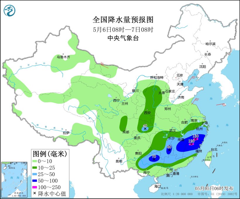 5月6日08时至7日08时,陕西大部、山西西部、江南、西南地区东部、华南中北部等地部分地区有中到大雨,其中,江西中东部、浙江南部、福建中北部、湖南东南部、广西北部等地部分地区有暴雨或大暴雨(100~130毫米)。内蒙古西部、辽宁、山东、河南东部等地部分地区有4~6级风。渤海、黄海中东部和东南部海域将有7~8级、阵风9~10级的大风,东海东部和西南部海域将有7级、阵风8级的西南风。