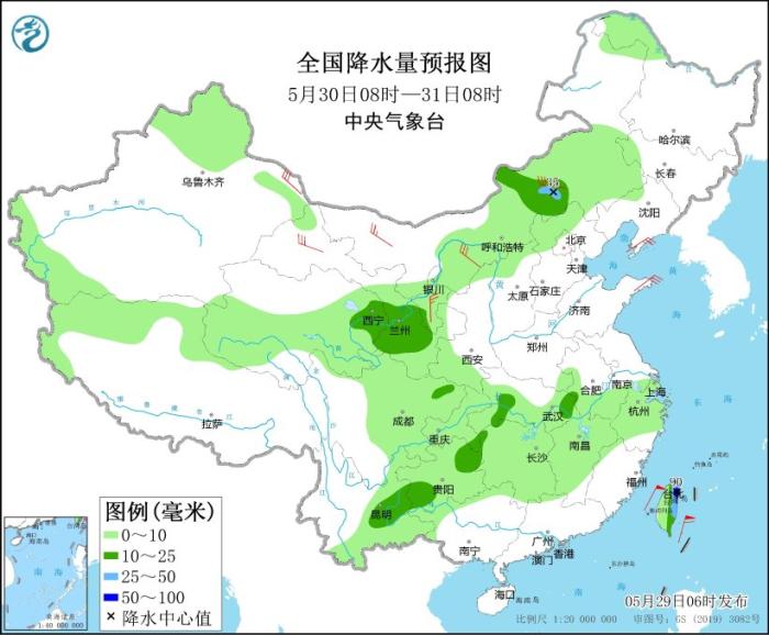 5月30日08时至31日08时,内蒙古中部、华北北部、西北地区中部和东部、新疆北部、西藏北部和西部以及西南地区东部和南部、江汉南部、江淮西部、江南大部、台湾岛等地部分地区有小到中雨,其中,内蒙古中部、台湾岛东部等地部分地区有大雨或暴雨(50~90毫米)。新疆东部、内蒙古、甘肃河西、宁夏、华北北部等地部分地区有4~6级风。