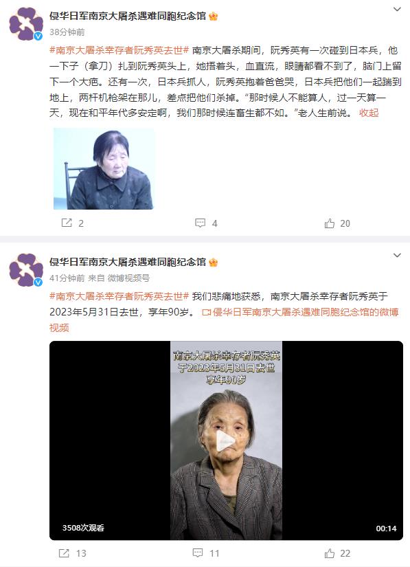 中新网6月2日电 据侵华日军南京大屠杀遇难同胞纪念馆官方微博消息,南京大屠杀幸存者阮秀英于2023年5月31日去世,享年90岁。