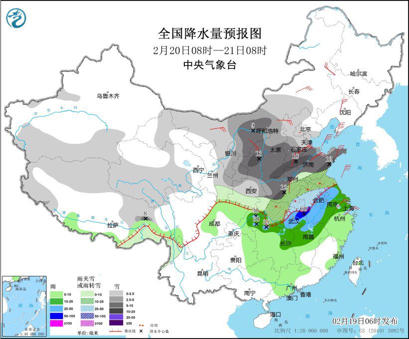 2月19日8时至20日8时,内蒙古河套地区、东北地区东部、新疆南部、西藏西部、陕西、华北西部等地部分地区有小到中雪或雨夹雪,其中,新疆南疆西部山区、西藏西部、山东南部等地部分地区有大到暴雪,局地大暴雪(20~25毫米)。苏皖北部、河南中部等地部分地区有冻雨。黄淮西南部、江淮西部、江西北部等地部分地区有中到大雨,局地有暴雨(50~55毫米)。内蒙古、辽宁、华北东部、山东半岛、江苏北部等地部分地区有4~6级风。渤海、渤海海峡、黄海大部海域将有7~8级风,阵风9~10级。