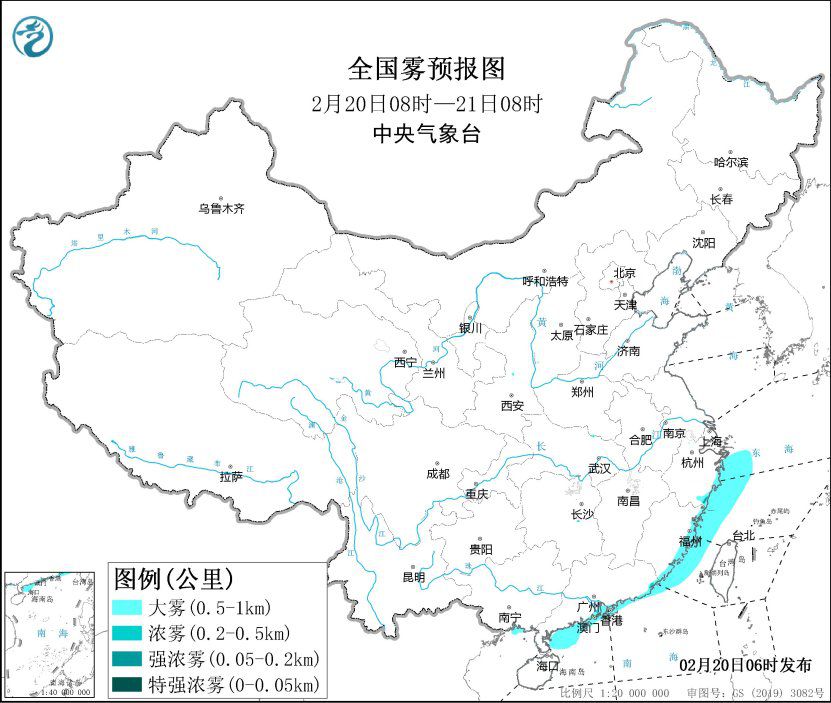预计,20日白天至夜间,东海西部海域、浙闽沿岸海域、台湾海峡、广东沿岸海域、广西沿岸海域将有大雾,能见度不足1公里。此外,20日早晨至上午,浙江东南部、广东东南部等地将有大雾天气,局地有能见度不足500米的浓雾。