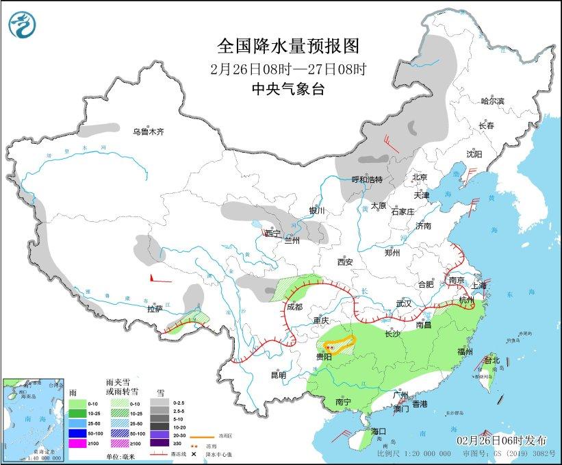 26日至27日,西南地区东部、江汉、江南、华南西部等地有小到中雨或雨夹雪,贵州中东部等地的部分地区有冻雨。此外,内蒙古中东部、华北北部、东北地区等地有小到中雪。