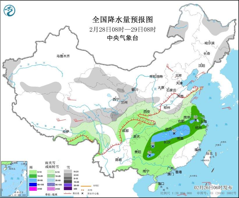 2月28日08时至29日08时,内蒙古西部和东北部、东北地区东部、新疆南疆、西藏东部、西北地区中东部、黄淮东部、安徽北部、江汉西部、川西高原北部等地的部分地区有小到中雪或雨夹雪。西藏东南部、西南地区东部、江汉、江淮、江南大部、华南西部等地的部分地区有小到中雨,其中,安徽中南部、江苏南部、湖北东部、湖南中西部和北部、江西北部、广西东北部等地的部分地区有大雨(25~40毫米)。内蒙古中部、辽东半岛、西藏北部、青海西部等地的部分地区有4~6级风。