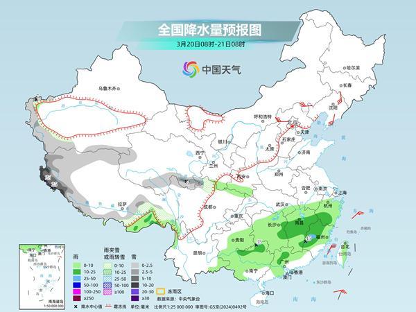 后天,新疆南疆西部和南部山区、青海西部和中部、西藏大部、辽宁东部、吉林东部、黑龙江东南部等地部分地区有小到中雪或雨夹雪,其中,西藏西部、吉林东部、黑龙江东南部等地局地有大到暴雪;西藏东南部、辽宁中部、贵州中北部、湖南中北部、江西西部等地部分地区有中到大雨,其中,湖南西部和东北部等地局地有暴雨。