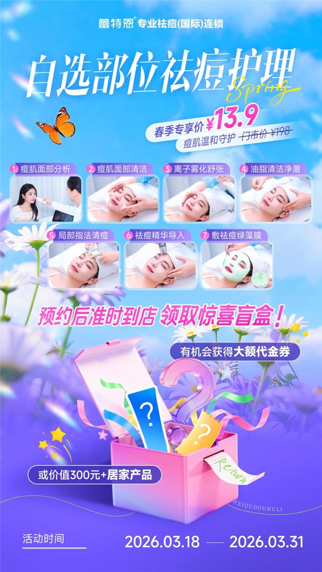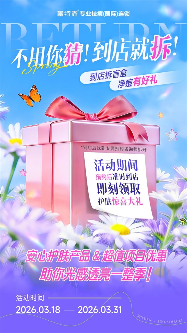 春光明媚,不负好时光。不要让痘痘、黑头影响拥抱春日的心情,也不要错过春季护肤黄金期。即刻线上预约蕾特恩“痘肌温和守护春日特惠专场”,参与惊喜盲盒活动,在专业护理中解锁素颜底气,在这个三月,遇见更干净、更自信的自己,让肌肤与春日一同焕新绽放。