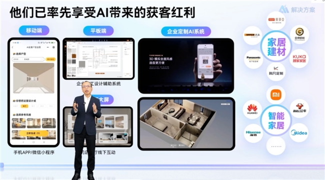 三维家副总裁曾冬发布AI新商业解决方案。在营销端,三维家将AI能力嵌入企业小程序、公众号等渠道,中小型企业可通过调用三维家SaaS工具大幅降低获客成本;在生产端,三维家平台已汇聚超9000家定制工厂,形成覆盖全国的“工厂圈”生态,实现装企与工厂的高效协同;针对新零售,三维家推出了板材、直播公司与工厂三方联动的云连锁模式,打通线上流量与线下交付;三维家前后端一体化海外版解决方案,支持20多种语言,可结合海外个性化工艺,助力企业全球化布局;此外,家居企业通过接入三维家提供的API接口,可共享其所构建的整合了真实商品模型、五金工艺生态库与第三方服务商的家居新生态,实现高效共赢。