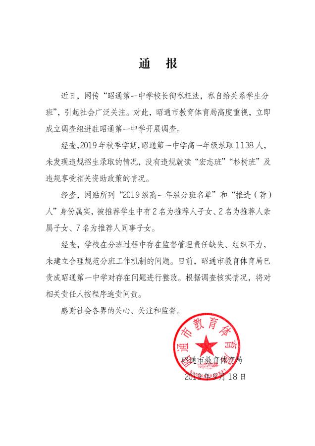 中新网9月19日电 云南昭通市教育体育局18日在官方网站发布通报称,近日,网传“昭通第一中学校长彻私枉法,私自给关系学生分班”,引起社会广泛关注。对此,昭通市教育体育局高度重视,立即成立调查组进驻昭通第一中学开展调查。