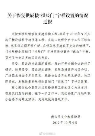 10月9日晚,云南省大理州巍山彝族回族自治县人民政府新闻办公室官方微博@名城巍山 发布了《关于恢复拱辰楼“拱辰门”字样设置的情况通报》(以下简称《情况通报》)。该《情况通报》)落款为“巍山县文化和旅游局”。