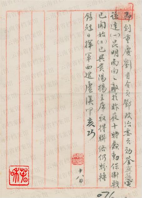 卢汉向刘伯承、邓小平致电报告:“(一)当前敌情无大变动。(二)昆明市工、农、学生接受本会号召,纷纷参加市区自卫队及组织支援前线工作团,协助作战。(三)据个旧市专员报告,匪二十六军集结蒙自之九十三师,有向元江江外逃窜企图。已电饬沿途地方,协同当地解放军予以截击。(四)对当前进犯残匪,仍本毛主席、朱总司令号召,尽一切可能,积极展开争取工作,以保全国家元气……(五)已电令宣威、沾益沿途地方,积极准备迎接解放大军……”