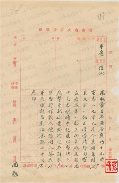 云南省档案局(馆)授权发布 解放云南档案(二) 昆明起义:加速西南解放进展