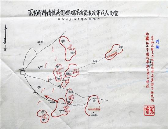昆明起义后由卢汉组建的云南人民临时军政委员会,在昆明受到围攻之际绘制了昆明保卫战敌情判断要图,标明“当面之敌主力似集结于右翼,将有拂晓开始围攻,一举而夺取昆明之模样”。