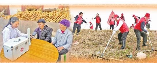 家庭签约医生服务村民(左)。志愿服务活动(右)。