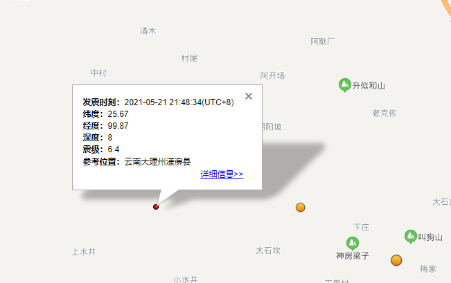 中国地震台网正式测定:05月21日21时48分在云南大理州漾濞县(北纬25.67度,东经99.87度)发生6.4级地震,震源深度8千米。