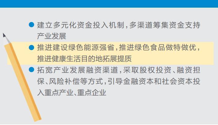 推进绿色食品做特做优,支持绿色食品初加工和精深加工,因地制宜打造一批绿色、有机、地理标志农产品。推进“种业芯片”工程,支持围绕“绿色食品牌”重点产业的农业种质资源开发、鉴定评价、推广应用和数据共享。创新“一县一业”财政支持政策和支持方式,促进产业升级和富民强县。