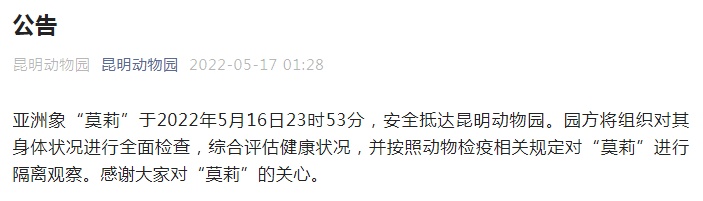 昆明动物园微信公众号截图人民网昆明5月17日电 (刘怡、蔡树菁)5月17日凌晨,“昆明动物园”微信公众号发布公告称,亚洲象“莫莉”于2022年5月16日23时53分,安全抵达昆明动物园。