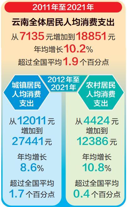 云南网讯(记者 胡晓蓉)国家统计局云南调查总队近日发布数据显示:2011年至2021年的十年间,云南全体居民人均消费支出从7135元增加到18851元,年均增长10.2%,超过全国平均1.9个百分点。