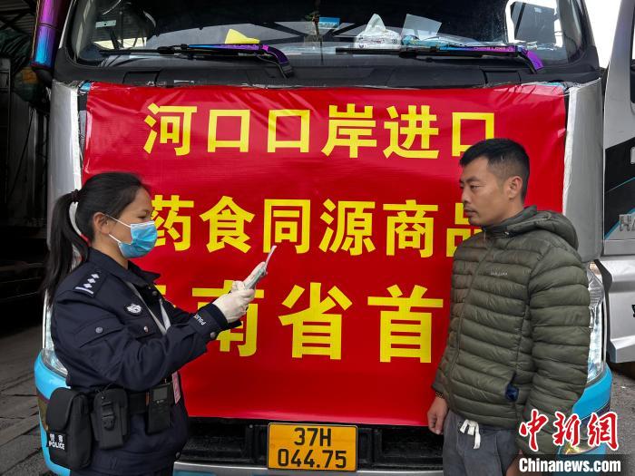这是药食同源商品首次经河口口岸入境,河口边检站执勤三队高度重视,主动靠前服务,开通“绿色”通道,为相关车辆、人员高效办理入境边防检查手续,助力该批商品顺利通关。