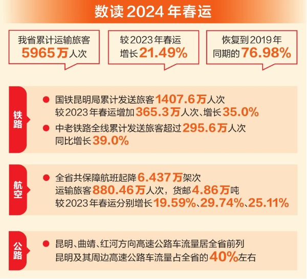 铁路客运量屡创新高。中国铁路昆明局集团有限公司累计发送旅客1407.6万人次,较2023年春运增加365.3万人次、增长35.0%,日均发送旅客35.2万人次,刷新春运历史纪录。从1月26日春运开启至2月22日,历时28天旅客发送量突破1000万人次,较2023年提前11天。国铁昆明局单日发送旅客量连续25天突破30万人次,连续8天单日发送旅客量突破40万人次。其中,2月17日单日发送旅客达48.3万人次,创春运单日发送旅客量最高纪录。丽江、西双版纳、曲靖北等12个车站单日发送旅客量均创造新纪录。