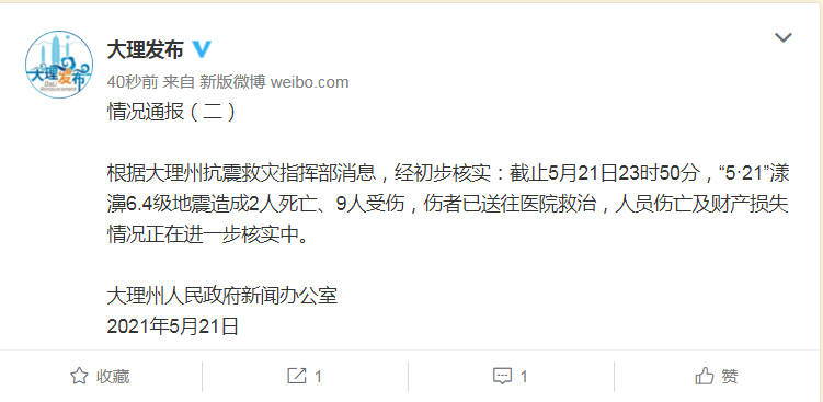 根据大理州抗震救灾指挥部消息,经初步核实:截至5月21日23时50分,“5·21”漾濞6.4级地震造成2人死亡、9人受伤,伤者已送往医院救治,人员... [更多详细]